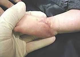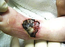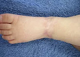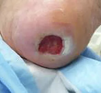 This 12 day old infant presented with a full thickness wound over the top of his left foot as a result of an adverse reaction to an IV. The parents were told by five physician specialists that grafting was the “only viable course of treatment” and “that it would most likely result in a permanent loss of ankle function.” To avoid the risks and trauma associated with the surgery the parents chose progressive wound management instead.