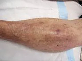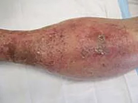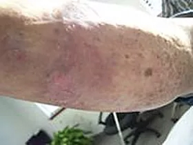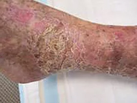 This 87 year old male presented with “non-healing wounds” and a rash over most of both legs from the knees down and of over 4 years duration. He had been treated without success at 4 or 5 different facilities. He opted for progressive wound management